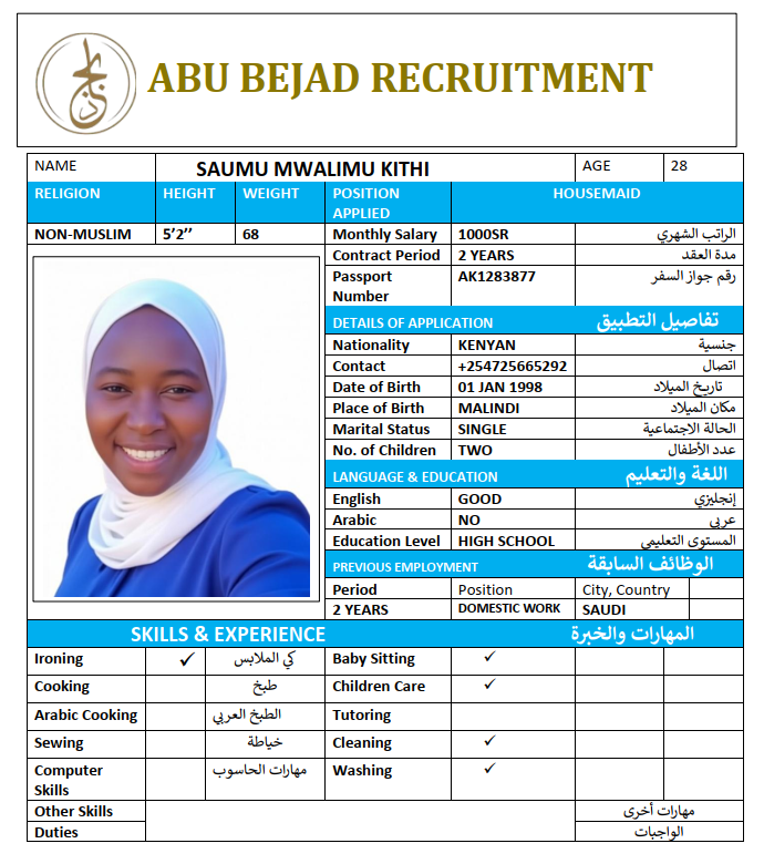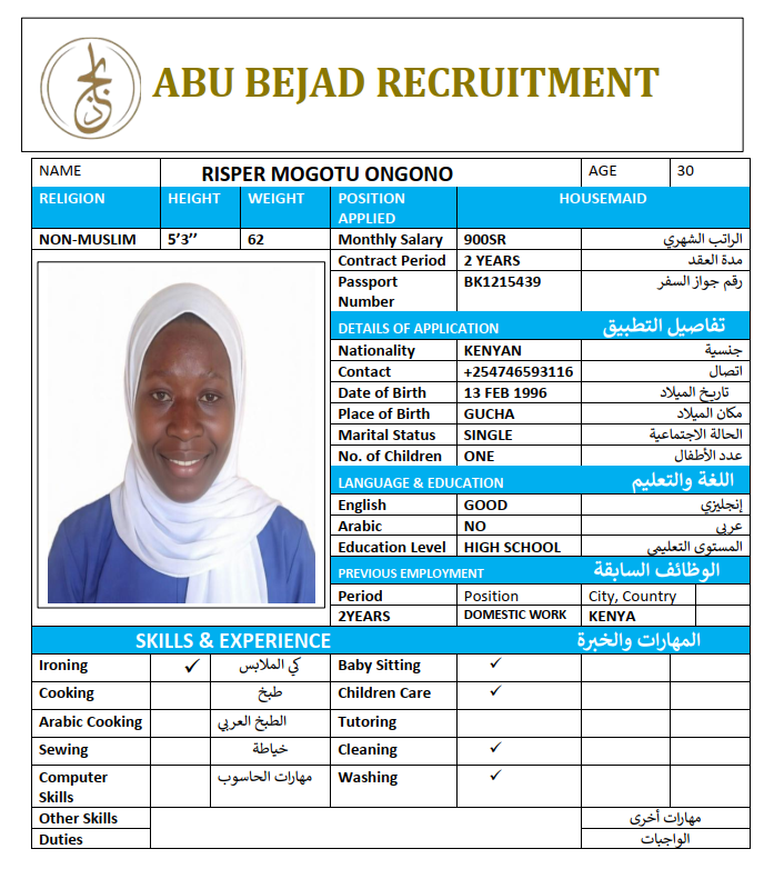 المهنة : عاملة منزلية